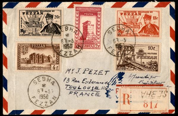 Raccomandata affrancata per 51 franchi (17 + 18 + 21 + 23 + 24) da Sebha a Toulouse del 6.5.50