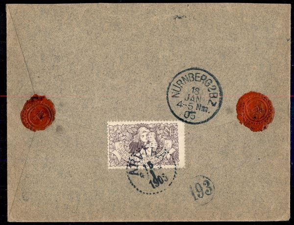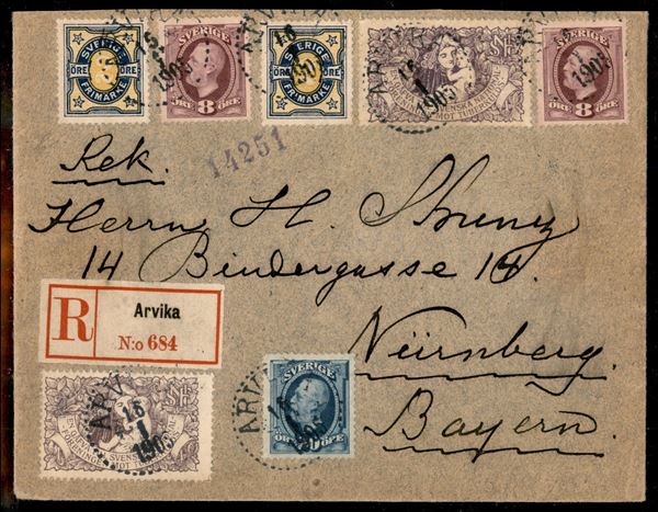 Raccomandata da Arvika a Norimberga del 15.1.1905 con affrancatura multipla + vignette chiudilettera