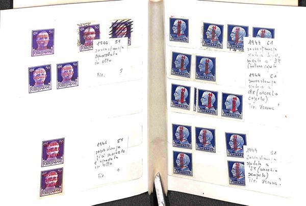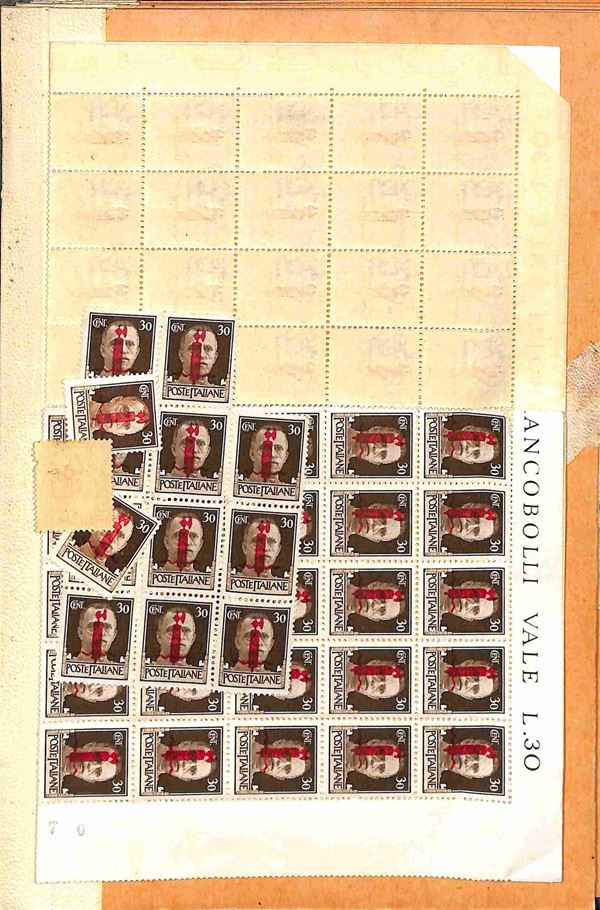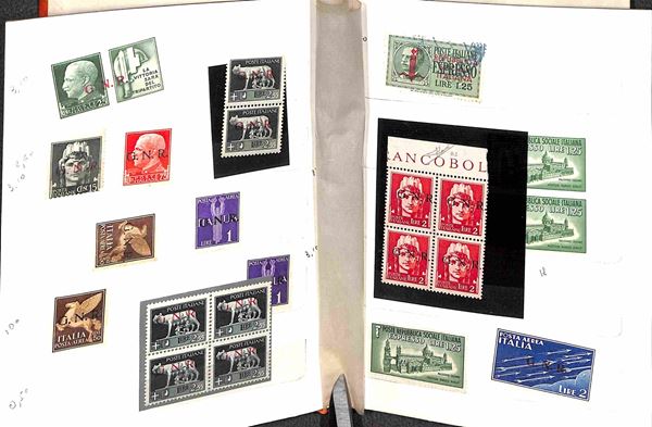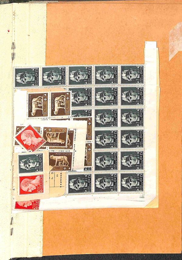 REPUBBLICA SOCIALE ITALIANA - 1943/1944 - Insieme di oltre 100 valori del periodo in 2 piccoli raccoglitori - presenti blocchi e strisce - gomma integra e originale - da esaminare