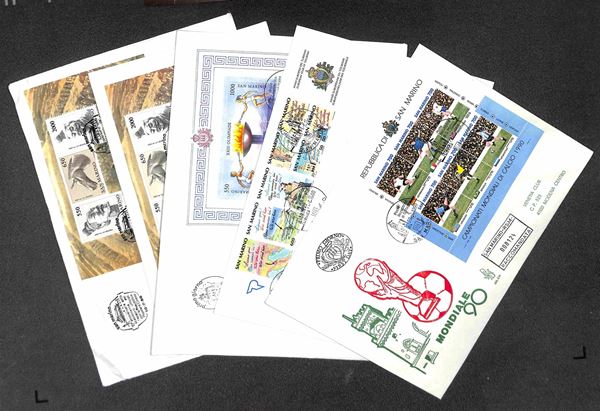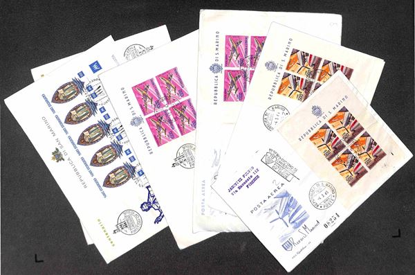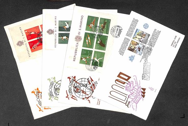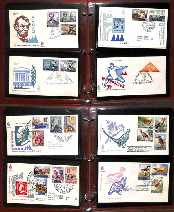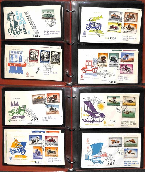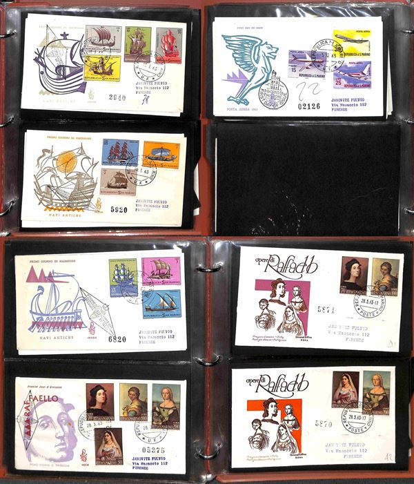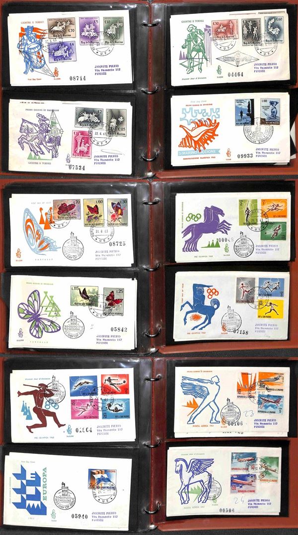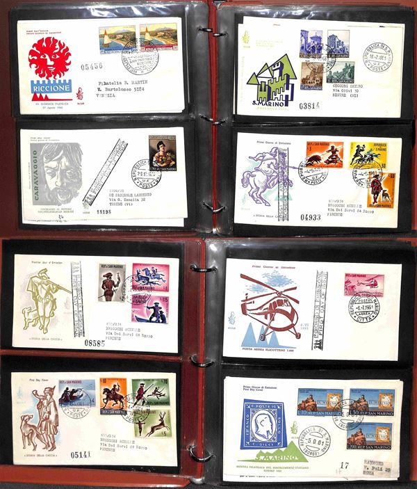 SAN MARINO - 1959/1991 - Collezione pressochè completa di FDC Venetia Club emessi nel periodo montati in 8 album raccoglitori - con molti doppioni emessi dalle poste di S. Marino - notati FDC Elicottero (singolo no foglietto) + Europa Unita - molto bella - valore di catalogo oltre 1100 €