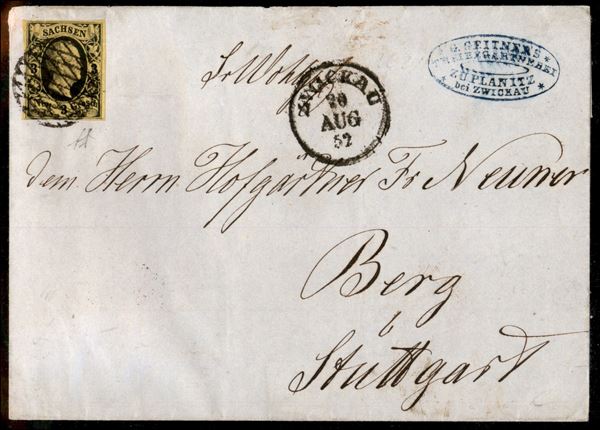 Sassonia - 3 groschen (6) isolato su busta da Zwickav a Berg del 20.8.52 - molto bella - E. Diena