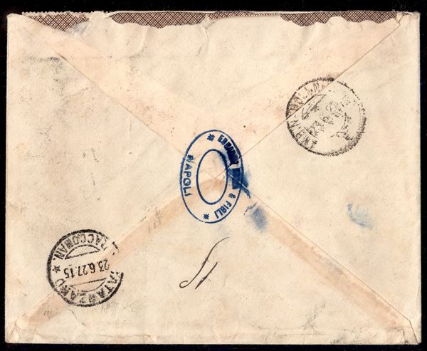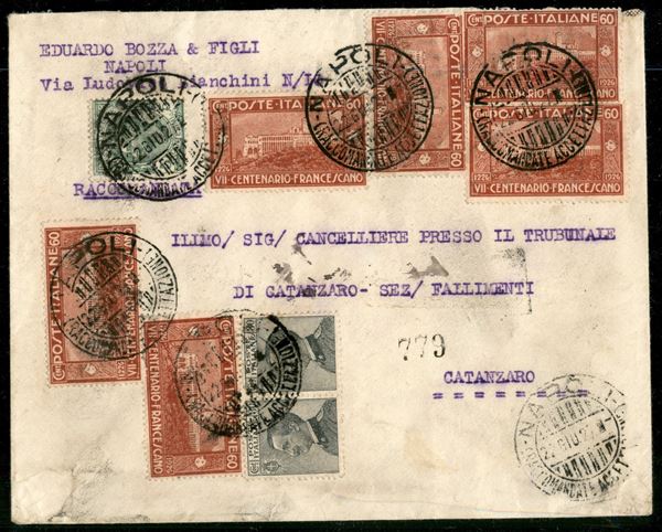 Sei esemplari del 60 cent S.Francesco (195) + complementari (81 + coppia 185) su raccomandata da Napoli a Catanzaro del 22.6.27