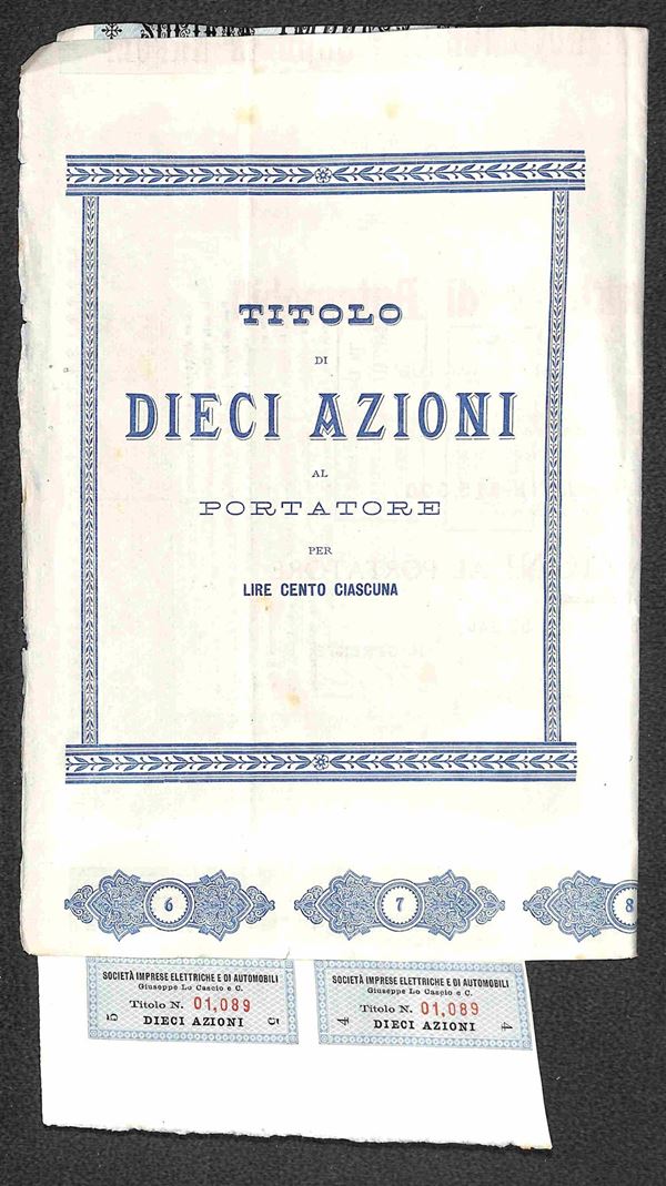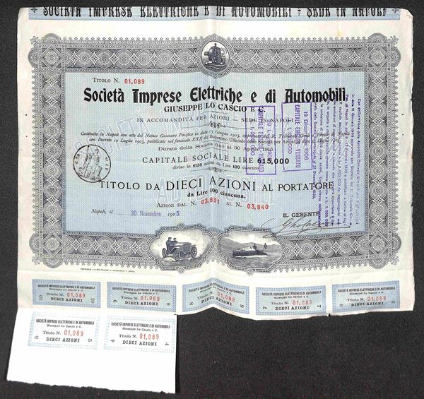 Società Imprese Elettriche e di Automobili - Giuseppe Lo Cascio - Napoli 30 novembre 1905 - Titolo N. 1,089 - Titolo da 10 Azioni (con uniti 7 tagliandi) - perfetta conservazione