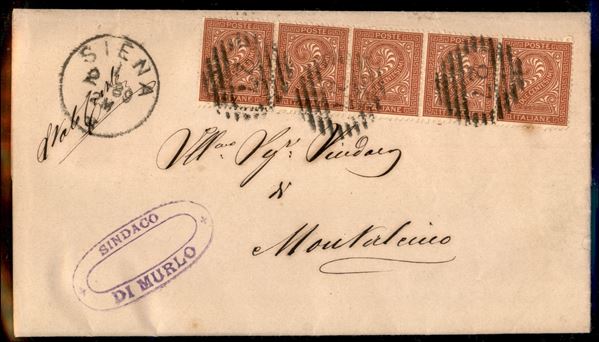 Striscia di 5 del 2 cent (15) su piego da Siena a Montalcino del 1.2.1889