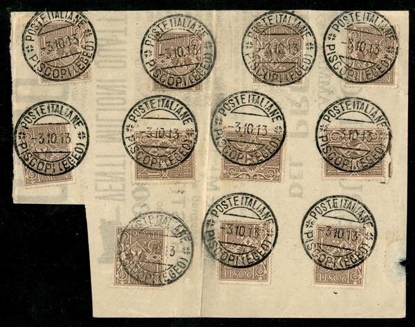 Undici 1 cent Floreale (68 - Regno) usati su frammento di giornale - Piscopi 3.10.13