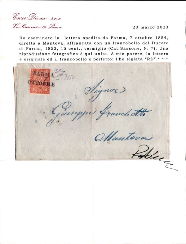 15 cent (7) su involucro di lettera da Parma a Mantova del 7.10.54 - cert. R. Diena