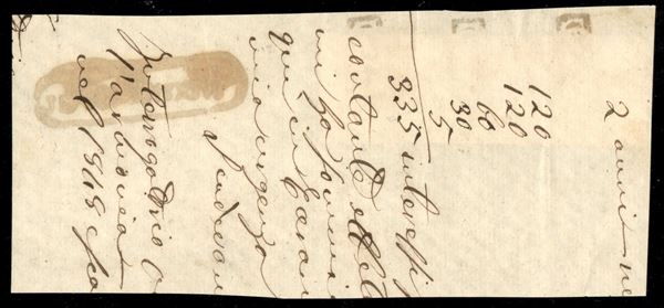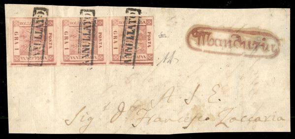 1851 - Striscia di tre del 1 grano (3) su frontespizio da Manduria - Gazzi + Diena