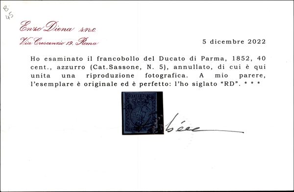 1852 - 40 cent (5) usato - cert. R. Diena