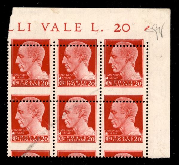 1929 - 20 cent Imperiale (247 fa) - blocco angolare di 6 con dentellatura orizzontale spostata in basso - gomma integra