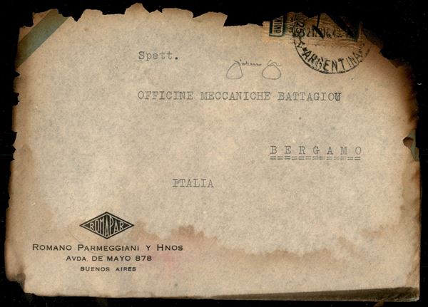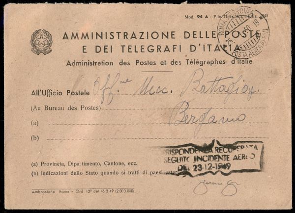 1949 (21 dicembre) Argentina Bergamo - aerogramma bruciato nell'incendio e relativa busta di servizio delle Poste "posta recuperata" dell'incidente aereo Dakar del 23/12/49 del volo Buenos Aires Roma