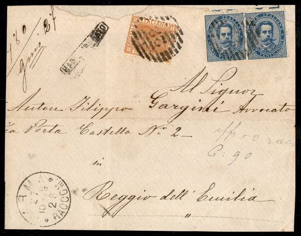 20 cent Vitt. Em. II + coppia 25 cent Umberto I (28 + 40) su frontespizio completo di raccomandata da Parma per Reggio Emilia del 27.10.79