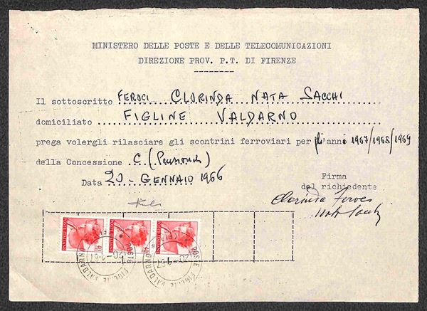 40 lire Michelangiolesca (906) - striscia di tre usata su modulo per richiesta rinnovo concessioni - Figline Valdarno 20.1.67