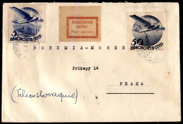 Aerogramma affrancato con 5 k + 50 k (41 + 44) da Mosca a Praga del 15.8.34 - molto bello e raro