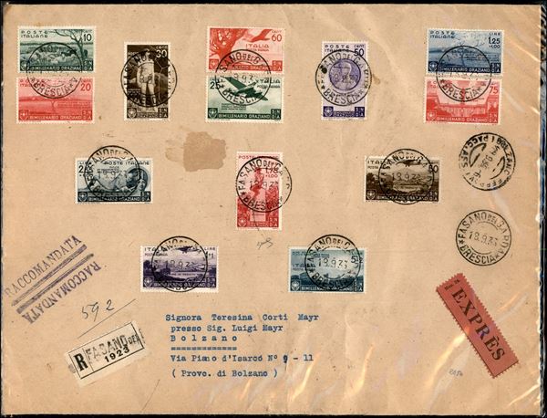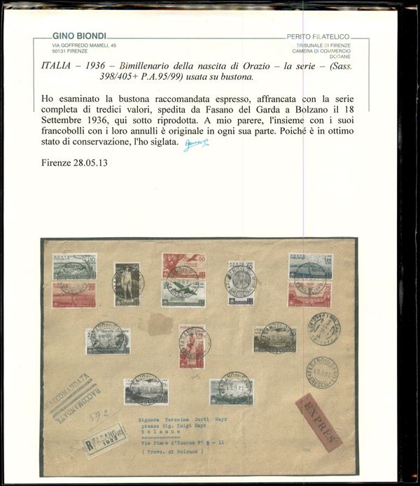 Bustone raccomandato espresso affrancato con serie completa Bimillenario Oraziano (398/405 + 95/99 Aerea) da Fasano del Garda a Bolzano del 18.9.36 - cert. Bioni
