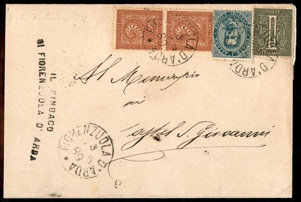 Coppia del 2 cent (15) + 5 cent (37) + 1 cent (14) in uso misto tricolore - piego da Firenzuola d'Arda a Castel S. Giovanni del 3.3.1889