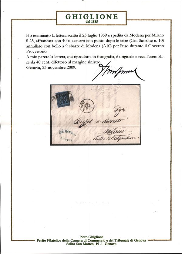 Governo Provvisorio - 40 cent (10) su lettera da Modena a Milano del 25.7.59 - cert. Ghiglione