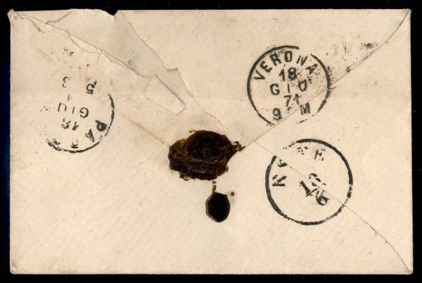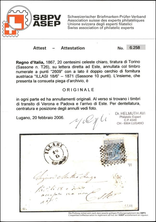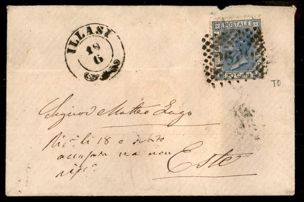 Illasi 18/6 (P.ti 10) su bustina affrancata con 20 cent (T26) annullato con numerale "2609" per Este - consueta piega d'archivio - cert. Avi