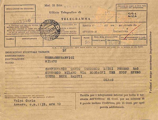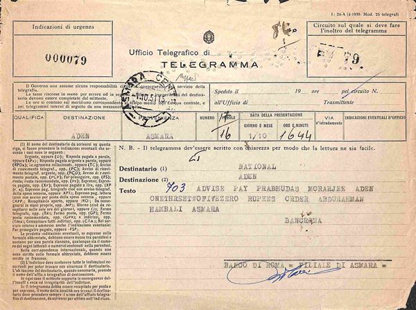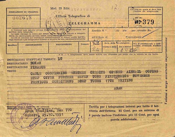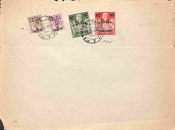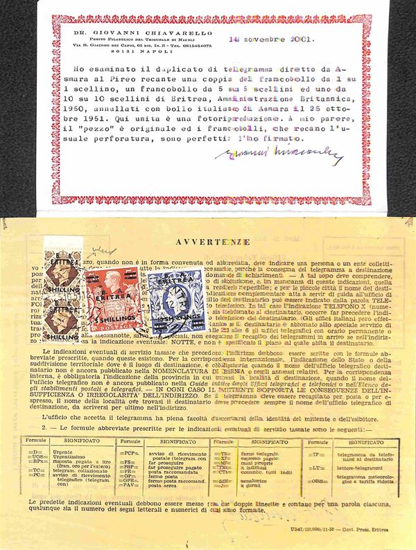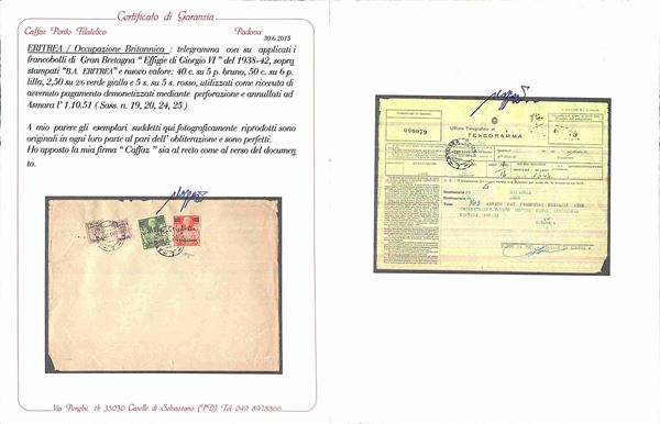 Insieme di 4 telegrammi affrancati con valori soprastampati B.A. Eritrea (18/19 + 23/26) demonetizzati mediante perforazione ad uso di ricevuta per avvenuto pagamento - 2 certificati - insieme interessante