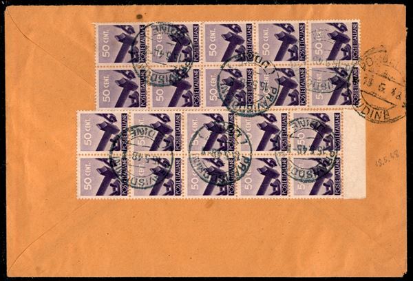Lettera da Pravisdomini per Pordenone del 15.5.48 affrancata al verso con due blocchi da dieci esemplari del 50 cent Democratica (547) - annullo verde