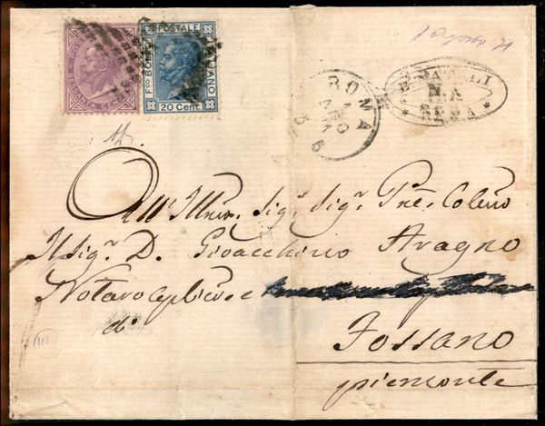 Lettera da Roma per Fossano del 1 ago. 71 con 60 cent + 25 cent (21 + 26) annullati con bollo muto sperimentale a rombi