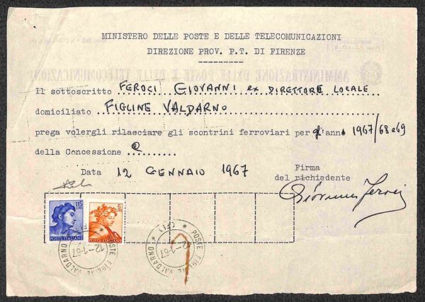 Michelangiolesca (902+913) - 2 valori usati su modulo per richiesta rinnovo concessioni - Figline Valdarno 12.1.67