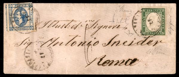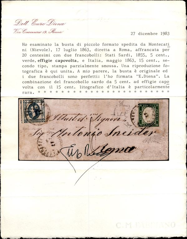 Mista con effigie capovolta - 5 cent verde (13Ea) + 15 cent Litografico (13) su bustina da Montecatini a Roma del 17.7.63 - 5 cent ben marginato e 15 cent appena corto in alto sull'angolo - combinazione molto rara - A. Diena + cert. E. Diena