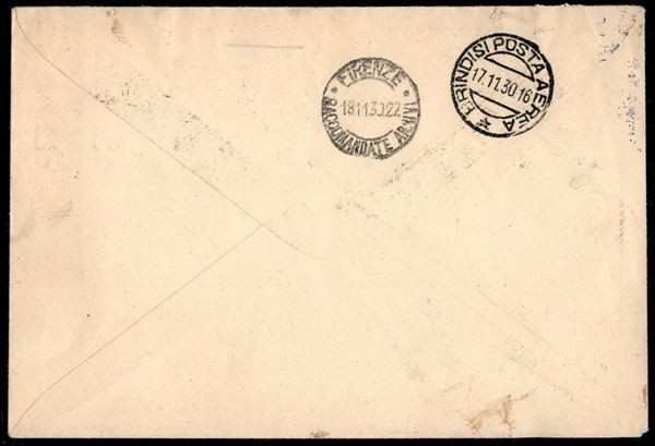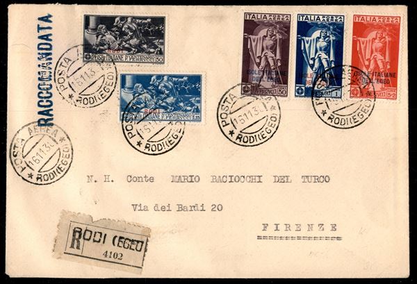 Raccomandata affrancata con serie completa Ferrucci Aerea (1/3) + 50 cent e 1,25 lire Rodi (17/18) da Rodi a Firenze del 16.11.30