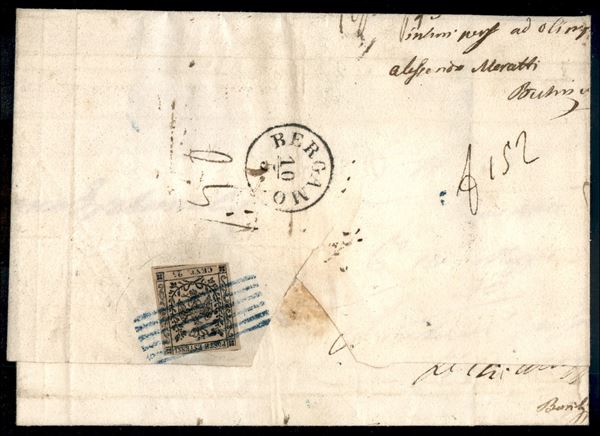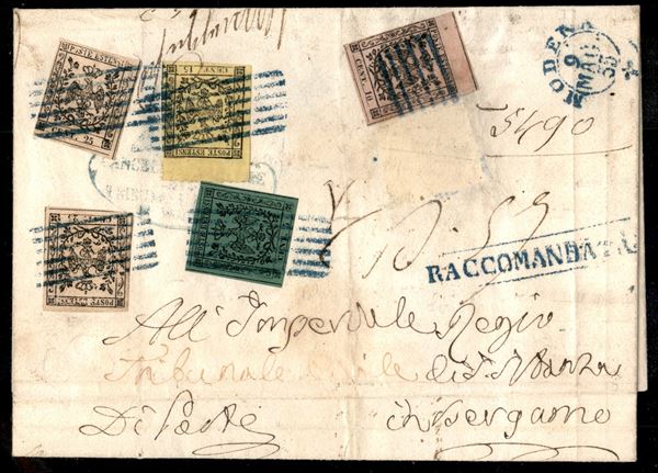 Raccomandata da Modena a Bergamo del 9.5.55 con affrancatura pentacolore multipla al recto (1 + 2 + 3 + 4 + 4) e raccomandazione (4) al recto - margini da buoni a ottimi - probabile affrancatura incompleta - da esaminare