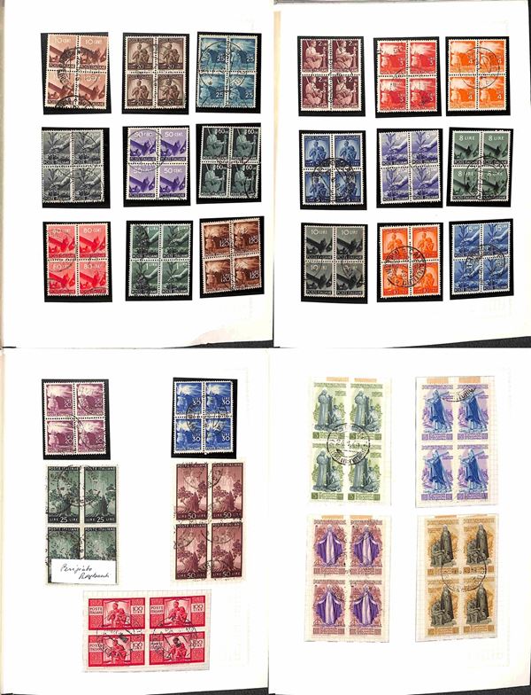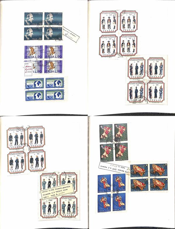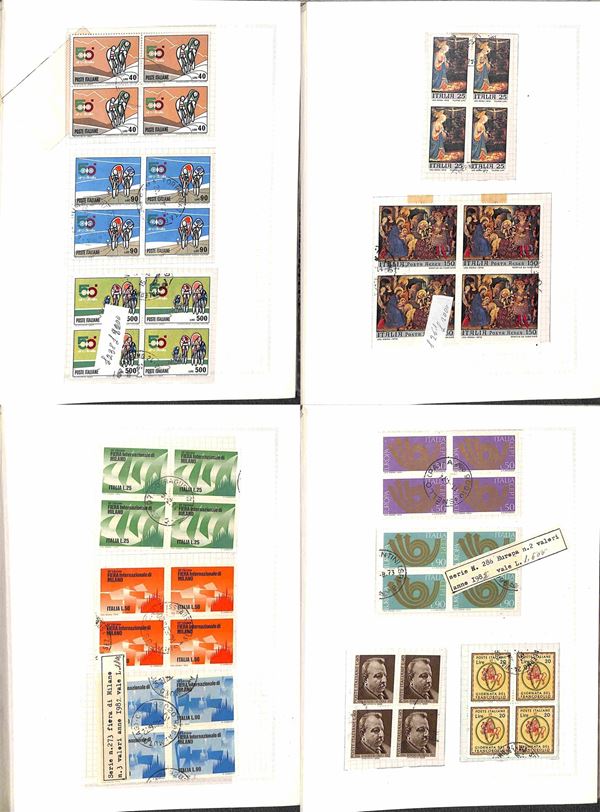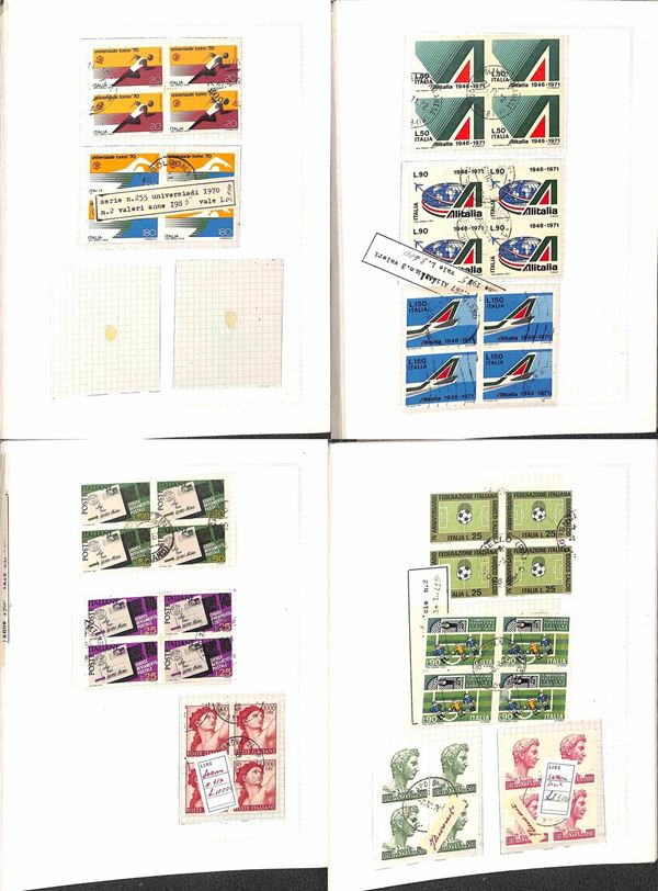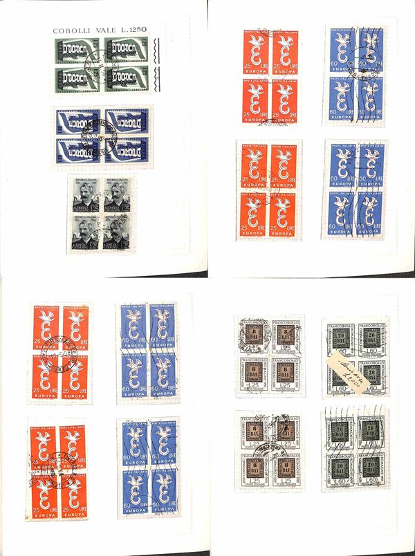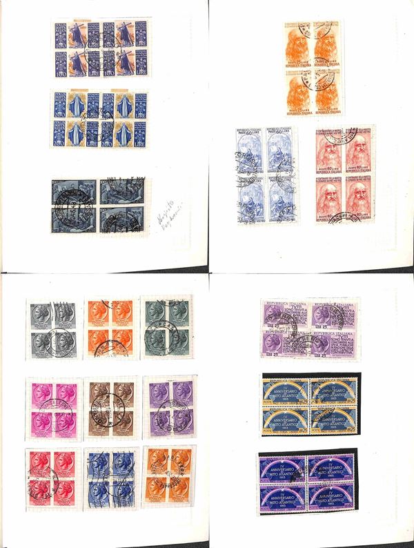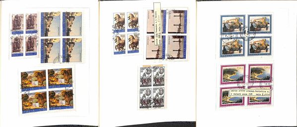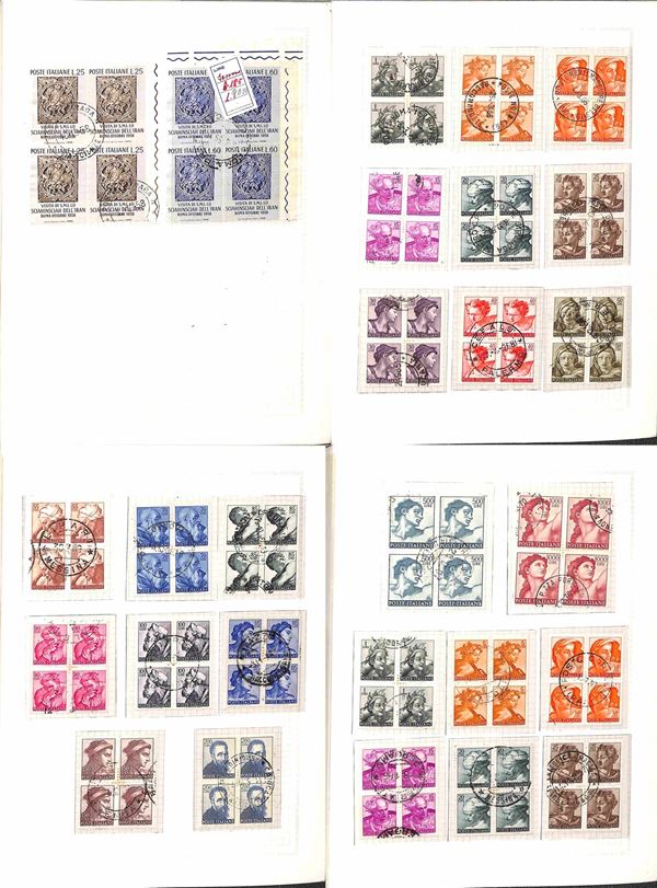 REPUBBLICA - 1945/1974 - Collezione di valori e serie complete usati in quartina del periodo - presenti Democratica e S. Caterina montati in album artigianale - valore di catalogo oltre 2000 € - merita esame
