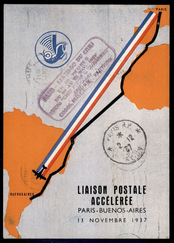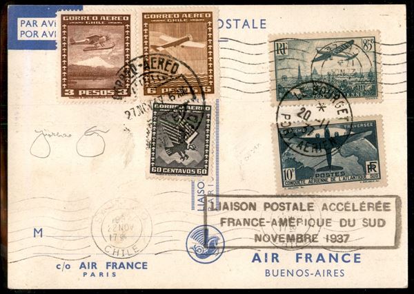 Volo Francia Sud America - cartolina del volo affrancata 10 franchi (321) + 85 cent Aerea (A8) da Le Bourget a Buenos Aires del 20.11.37 con timbri speciali del volo - Longhi