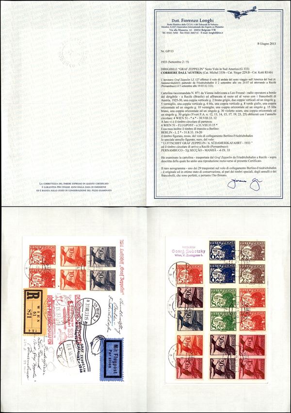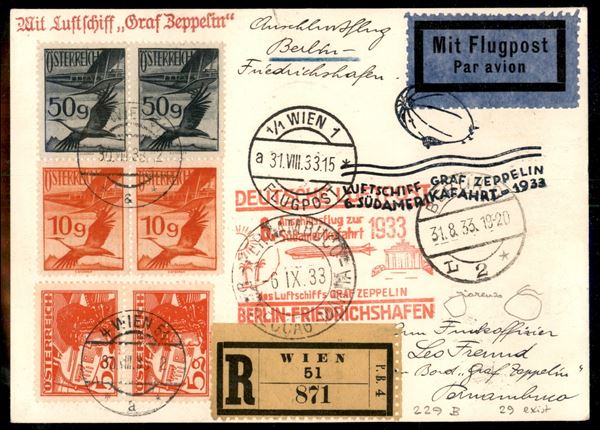 Zeppelin VI Sudamerikafahrt - cartolina raccomandata con affrancatura mista (A12 + A15 + A17 + A19 + A23 + A25) da Vienna a Penambuco del 1.8.33