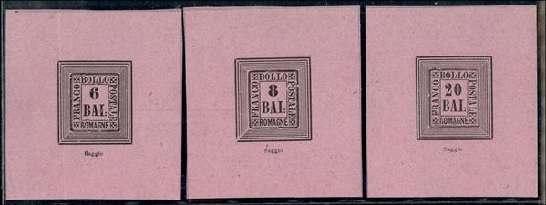 1859 - Ristampe - 3 valori con dicitura "Saggio" su foglietti con carta violetta - nuovi senza gomma