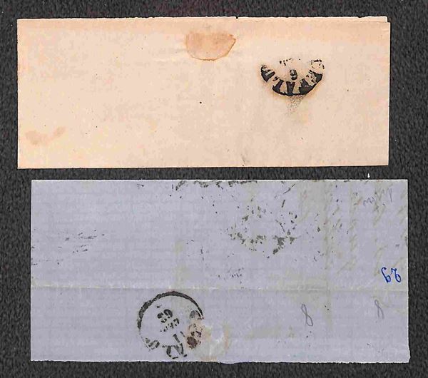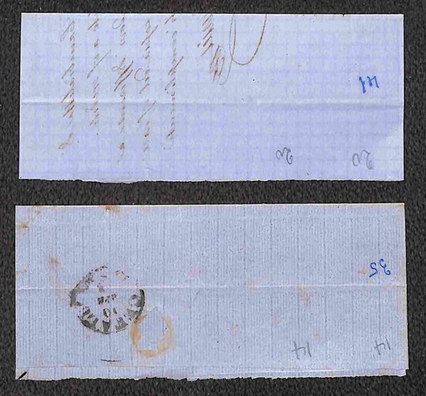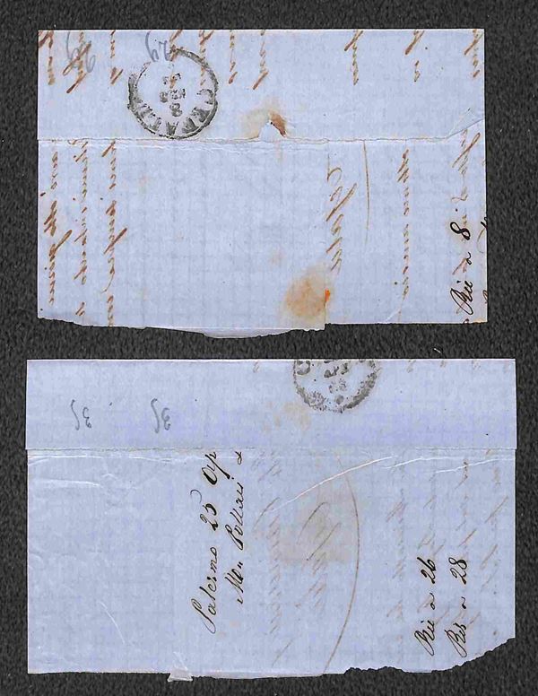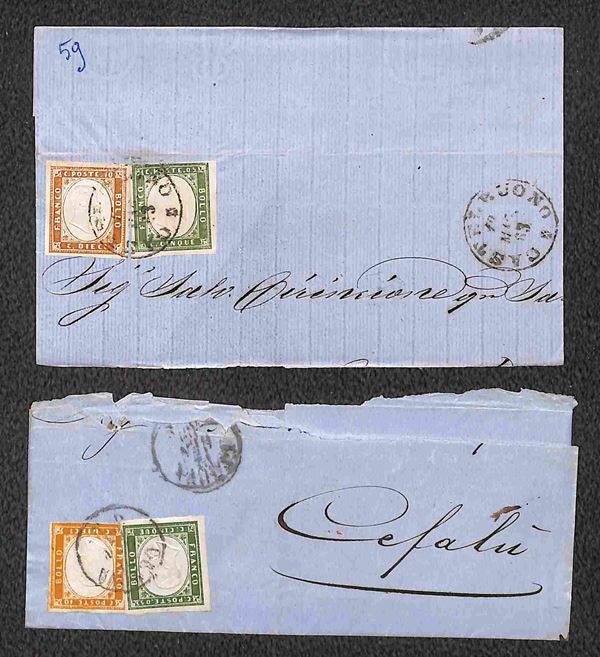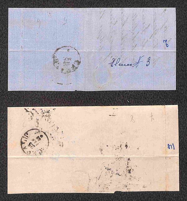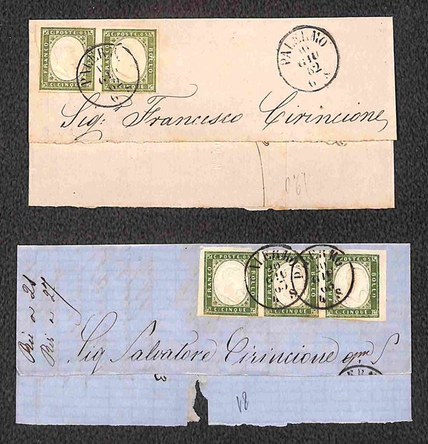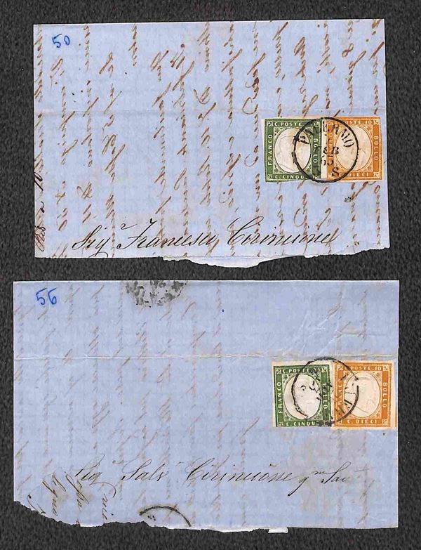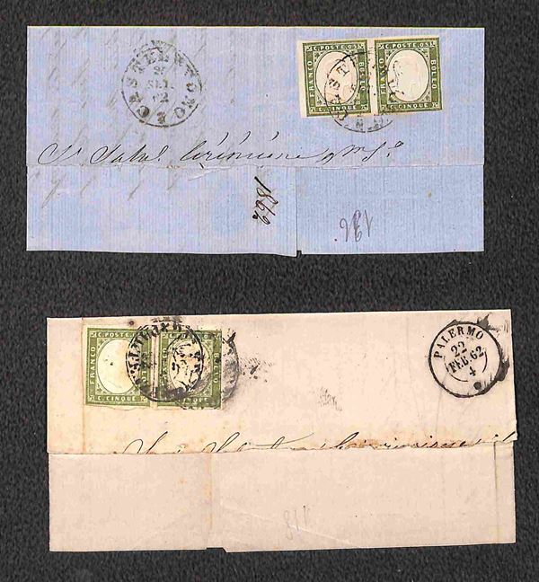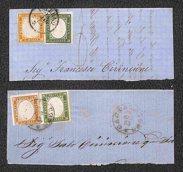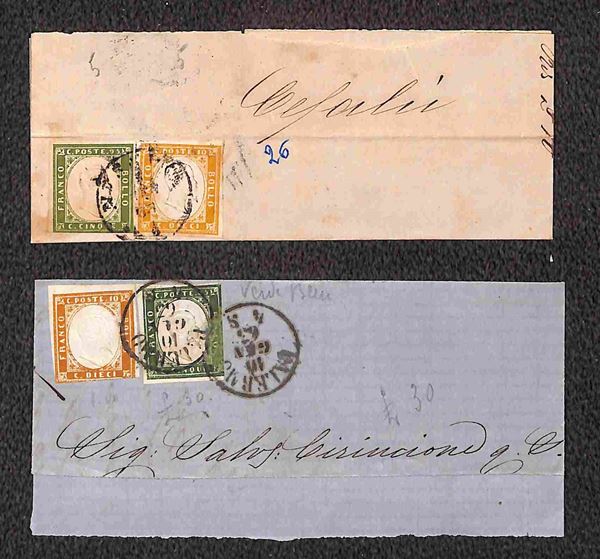 1861/1863 - quattro testatine di lettere col 5 cent (Sardegna) in coppia orizzontale e striscia di tre + otto testatine con affrancatura bicolore (5+10 cent Sardegna) - qualità mista - da esaminare