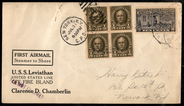 1927 (31 luglio) - Ship to Shore - New York Newark - Muller 238 - aerogramma del volo