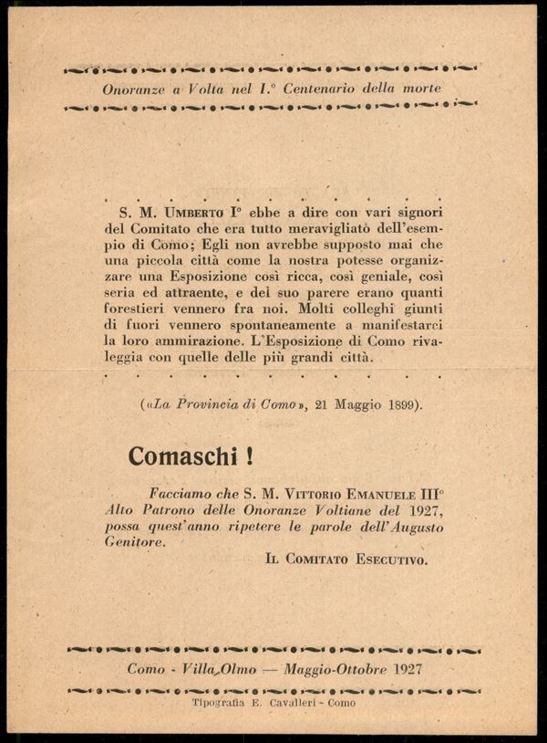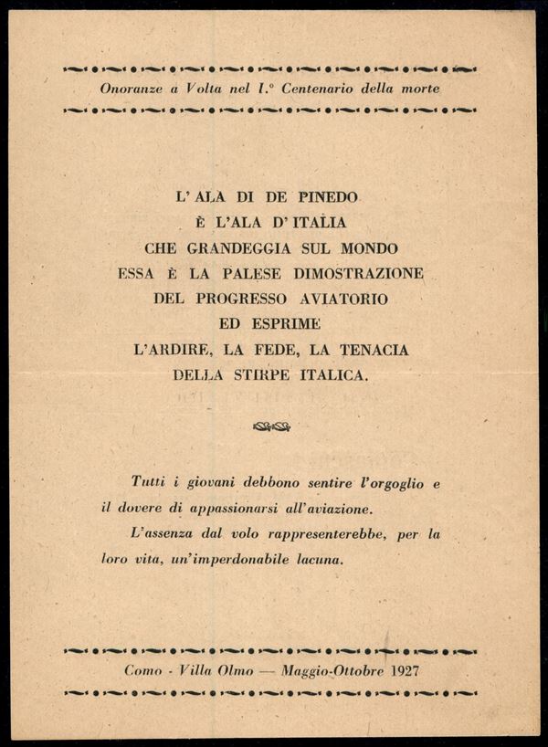 1927 (maggio/ottobre) - L'Ala di De Pinedo/Onoranze a Volta - Como Villa Olmo - volantino