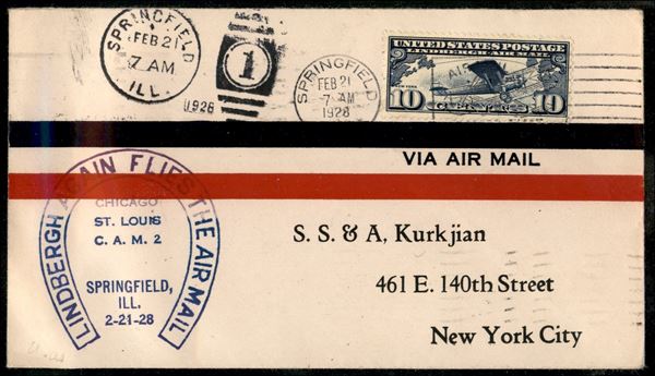 1928 (21 febbraio) - Lindbergh - Springfield New York - Muller 245 - aerogramma del volo