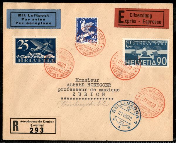 1932 (21 agosto) - Ginevra Bellinzona - Muller 338 - aerogramma raccomandato per Zurigo