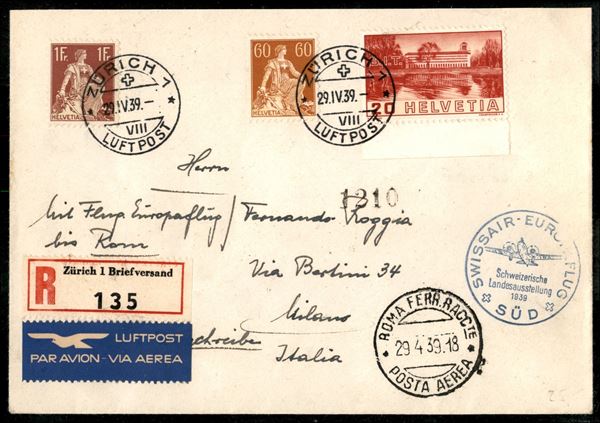 1939 (29 aprile) - Zurigo Roma - Muller 419 - Longhi 3828 - aerogramma raccomandato per Milano