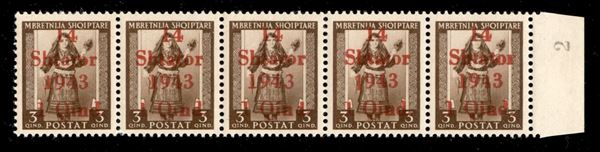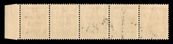 1943 - 3 qind (3) - striscia orizzontale di 5 (pos. 56/60) - 3 diverso (pos. 58) + 4 rotto (pos. 70) + 1 di 1943 lungo (pos. 59 - Michel tipo XII) - gomma integra
