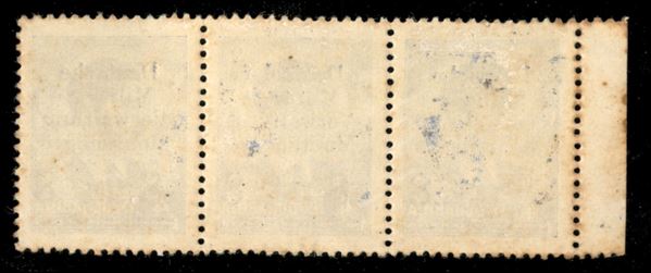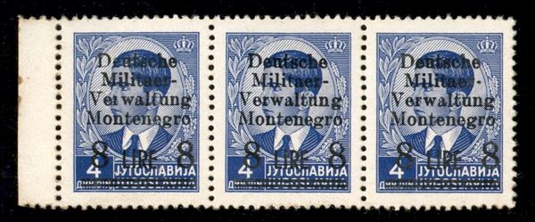 1943 - 8 lire su 4 din (7 varietà) - striscia orizzontale di tre - pezzo di sinistra con prima e di Deutsche consumata + r di Verwaltung rotta - gomma integra (sofferta) con macchie d'umido