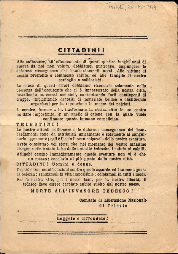 1944 (20 giugno) - Volantino "Comitati di Liberazione Nazionale di Trieste" - Morte all'invasore Tedesco