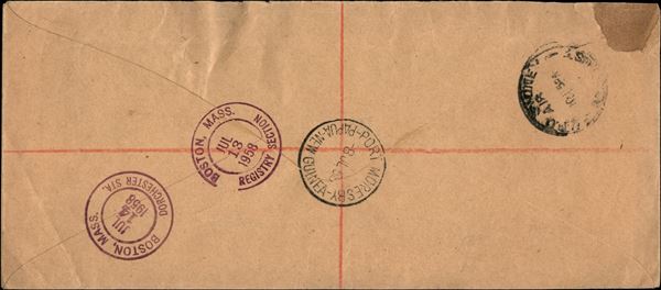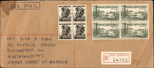 1958 - Aerogramma raccomandato affrancato con quartina del 3 1/2 pence (7) + quartina del 7 pence (11) da Port Moresby a Boston del 8.7.59