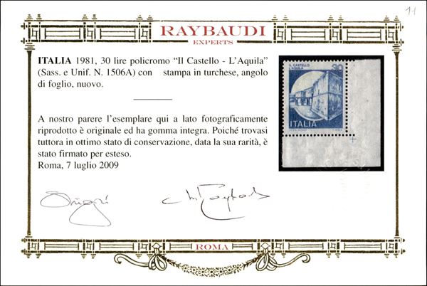 1981 - Aquila - Naturale azzurro - 30 lire Castelli (1506A) - gomma integra - cert. Raybaudi
