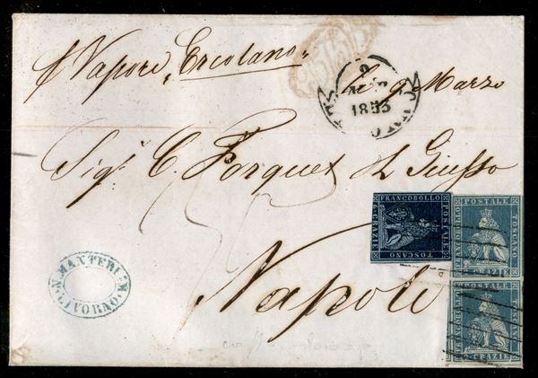 Coppia verticale del 2 crazie (5) lievemente corta in alto a sinistra il resto con grandi margini e parti di vicini + 6 crazie (7b) corto in basso su lettera da Livorno a Napoli del 9.3.53 col vapore Ercolano - Tassata