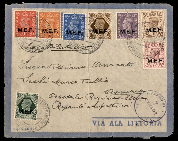 Otto valori (6/13) su frontespizio di busta per cittą - Asmara 27.5.43
