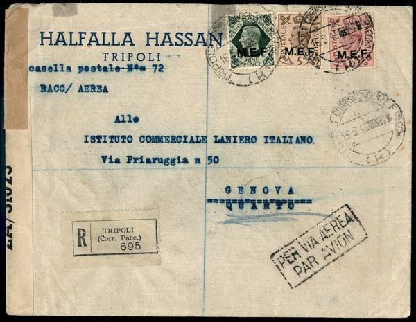 Tre valori (10/12) su aerogramma raccomandato da Tripoli a Genova del 16.9.45