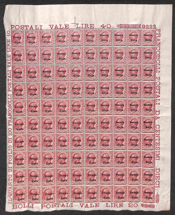 1918/1919 - Intero Foglio completo di margini del 10 cent (22) con a di Giulia di carattere diverso - gomma integra