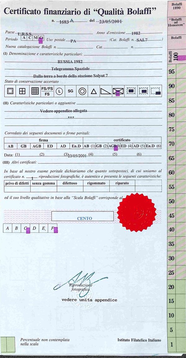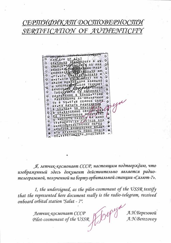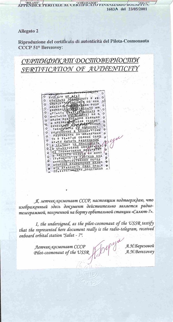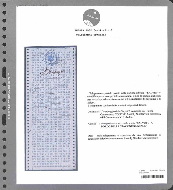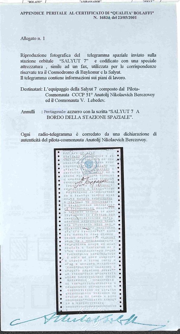 1982 - Telegramma spaziale inviato sulla stazione orbitale Salyut 7 e codificato con una speciale attrezzatura simile al fax - contiene informazioni sui piani di lavoro - dichiarazione di autenticità del pilota Berezovoy - montato su fogli GBE - cert. Finanziario Bolaffi