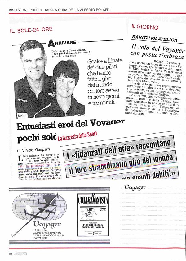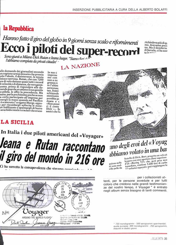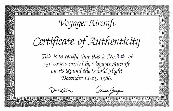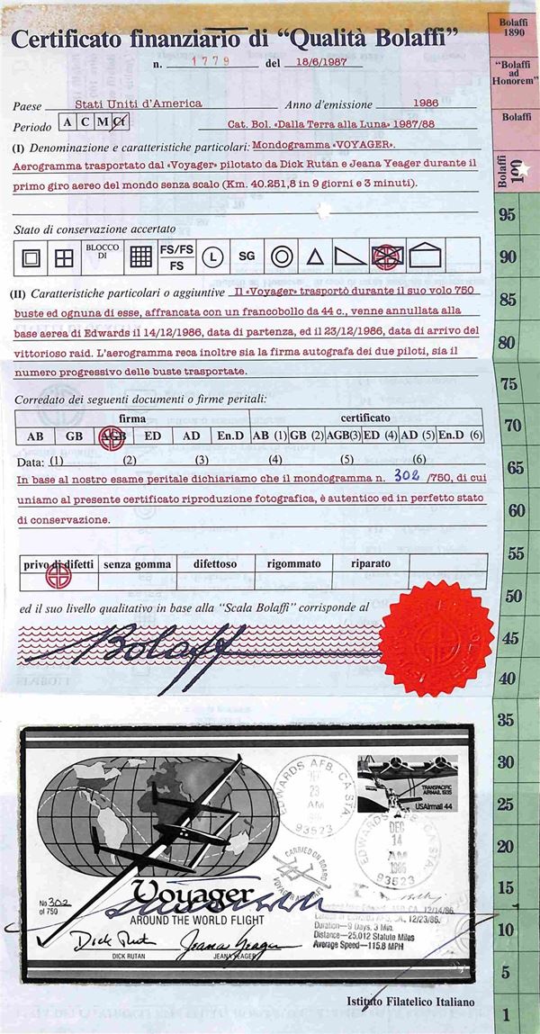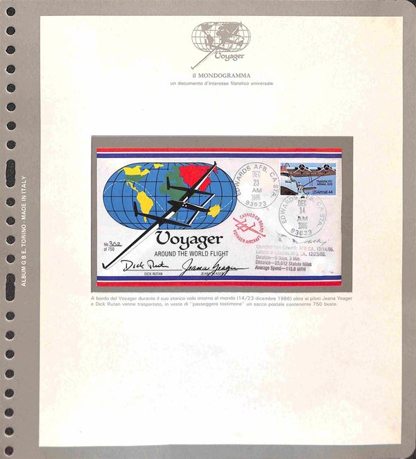 1986 - Aerogramma del volo Voyager intorno al Mondo - numero 302/750 - firme dei piloti - montato su fogli GBE - cert. di autenticità e cert. Finanziario Bolaffi