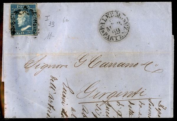 2 grana (6a - posiz. 33) isolato su lettera da Palermo a Girgenti del 2.3.1859 - A. Diena